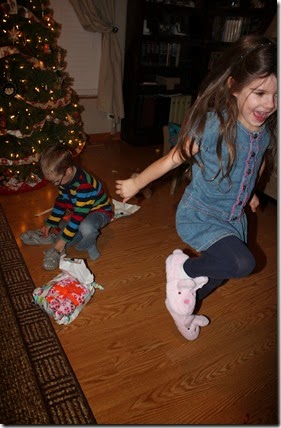 We were shocked when the kids didn’t wake up until 7:15! They would have raced right out to the tree, but we made them wait until Grandpa got up and dressed. It wasn’t too long thankfully because they were really excited! After opening their stockings, we had family prayer and then the fun began.