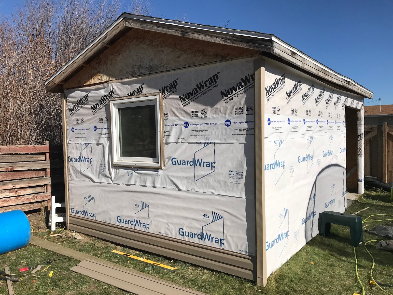 Saturday, while the kids were at Champs (basketball), we got the shed wrapped and then we started putting siding up!
